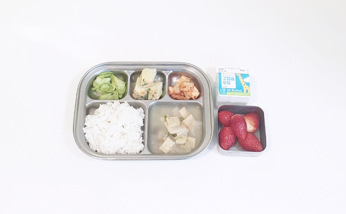 2025.3.4(화) 중식식단 - 백미밥,어묵국,삼색달걀찜,오이무침,배추김치 (후)딸기,우유