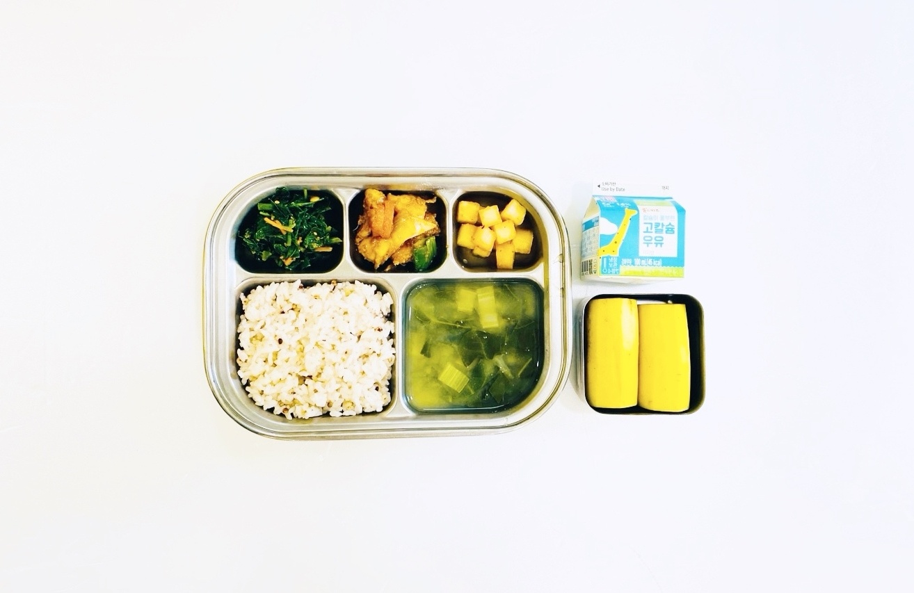 2025.3.10(월) 중식식단 - 차조밥,무채된장국,돼지고기고구마조림,잔멸치볶음,배추김치 (후)복숭아젤리,우유