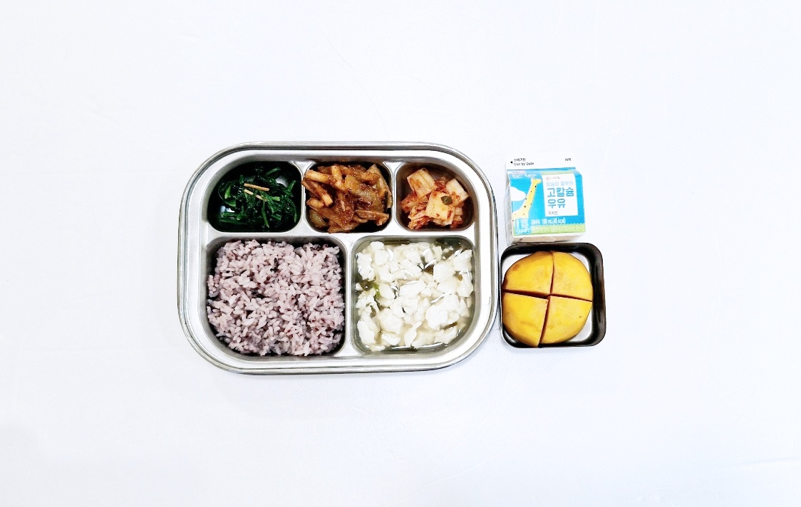 2025.2.17(월) 중식식단 - 흑미밥, 맑은순두부국,오징어볶음,시금치나물, 배추김치(후)단감,우유