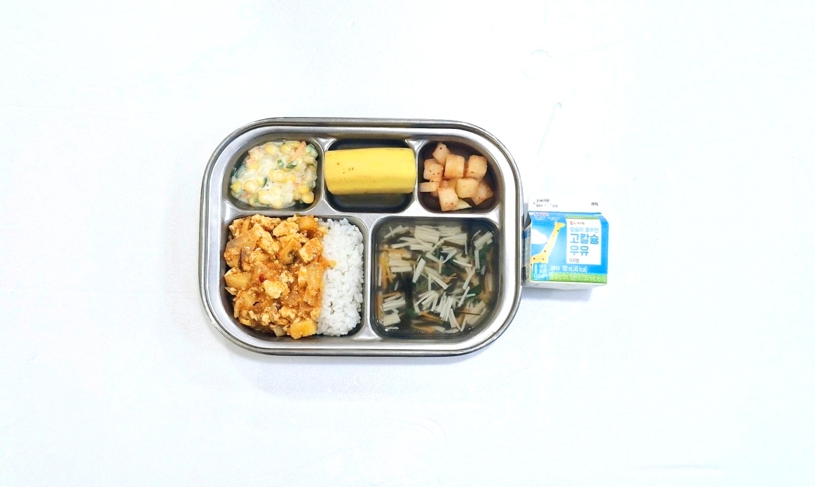 2025.2.20(목) 중식식단 - 마파두부덮밥,팽이미소장국,콘샐러드,깍두기(후)바나나,우유