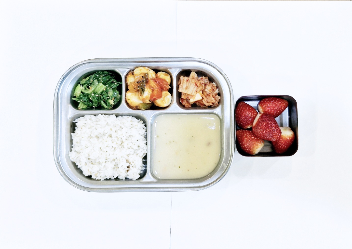 2025.2.21(금) 중식식단 - 차조밥,크림스프,메추리알채소폭찹,청경채나물, 배추김치(후)딸기