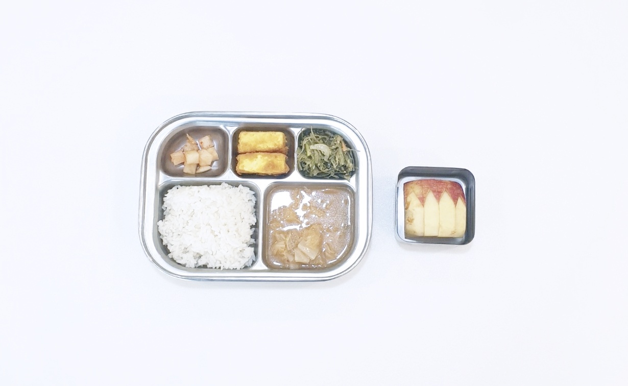 2025.2.24(월) 중식식단 - 백미밥,김치찌개,두부카레부침,미역줄기볶음,깍두기 (후)사과
