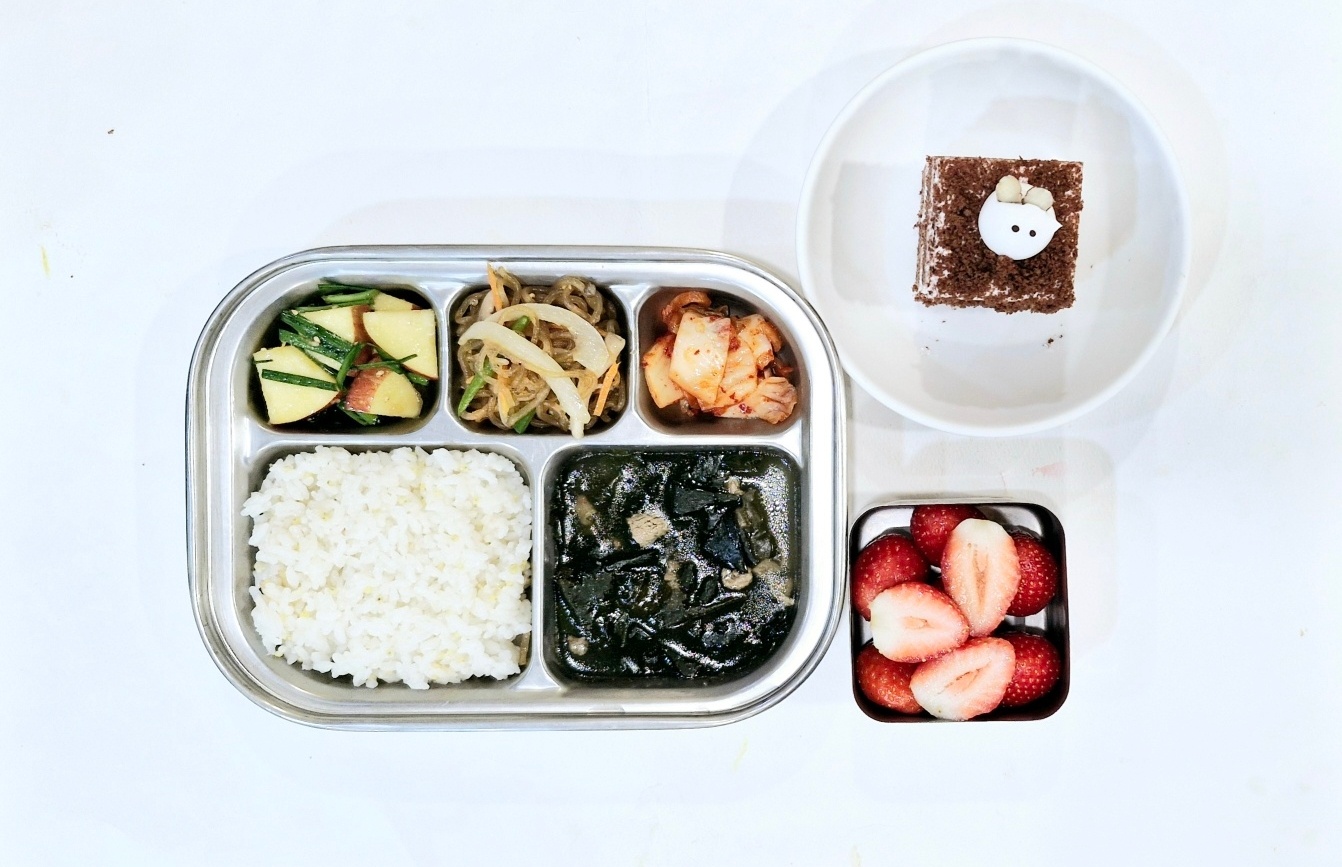 2024.12.17(화) 중식식단(생일식단) - 기장밥,쇠고기미역국,버섯잡채,부추사과무침,배추김치 (후)딸기, 케이크