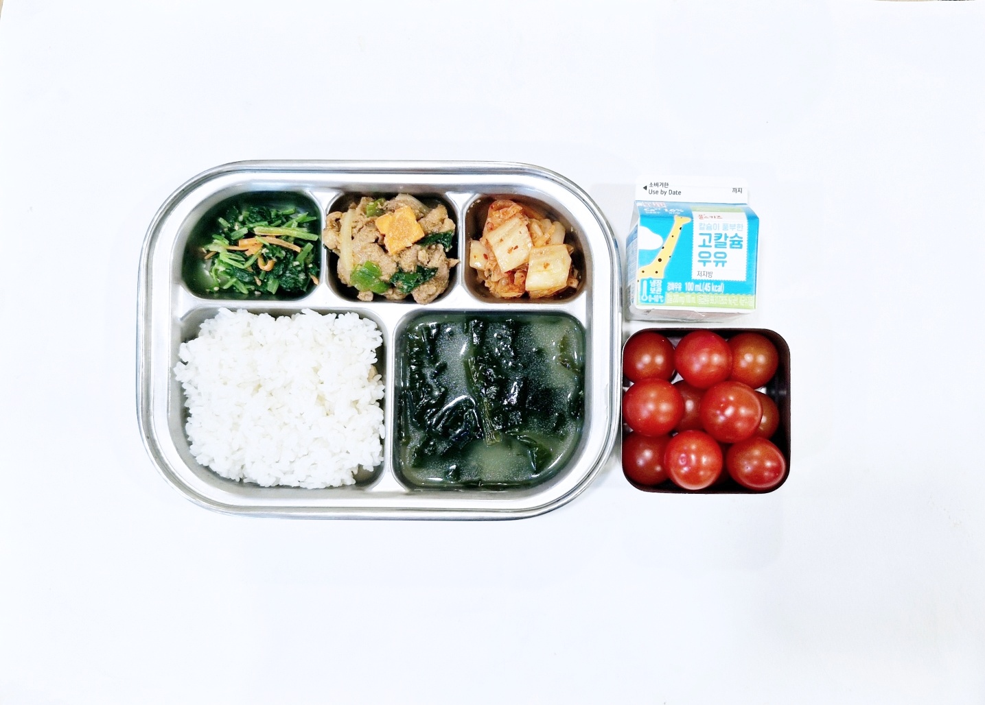 2024.12.5(목) 중식식단 - 백미밥,미역국, 돼지고기두루치기,유채나물무침,배추김치 (후)방울토마토, 우유