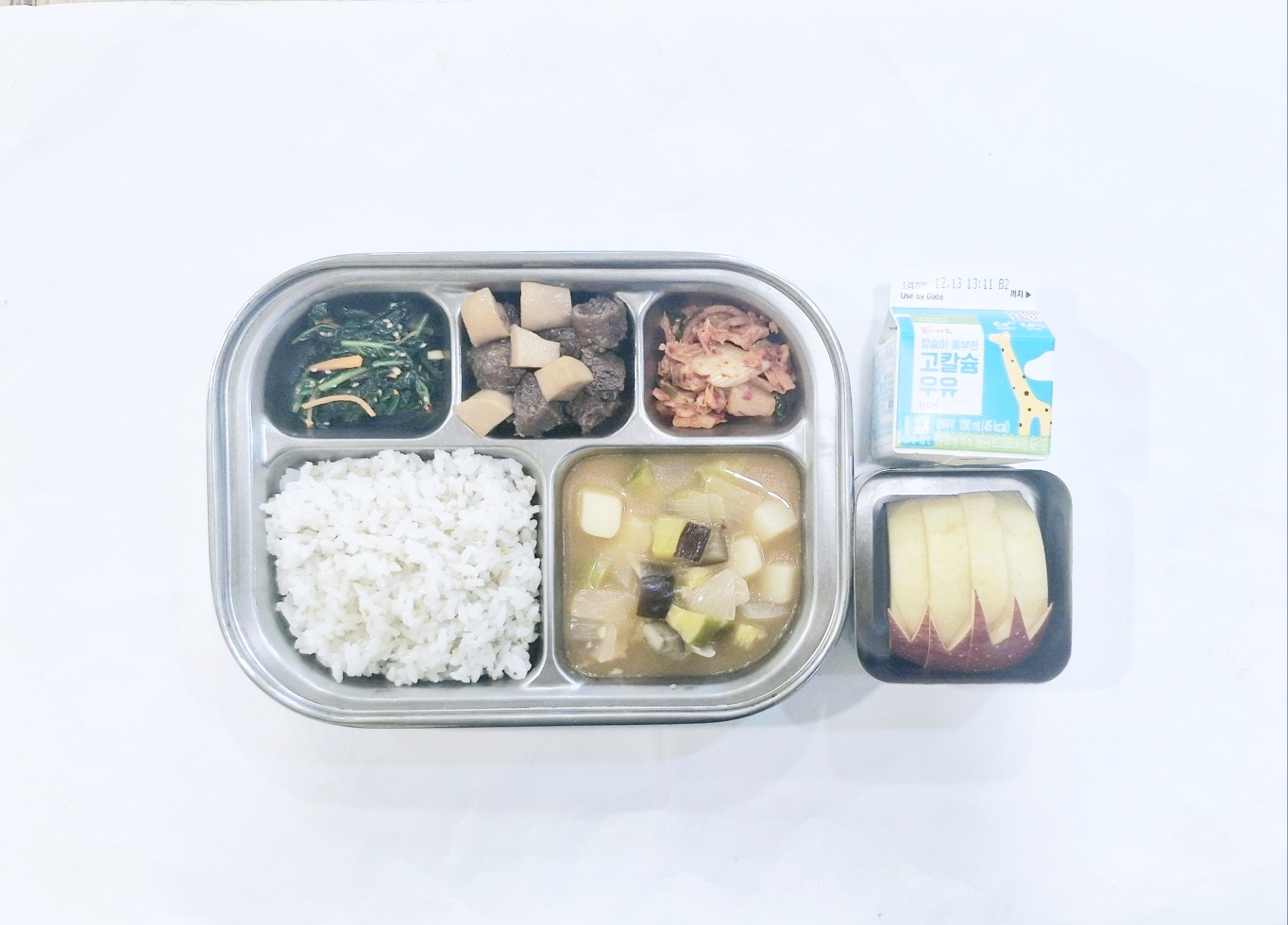 2024.12.6(금) 중식식단 - 차조밥,애호박고추장찌개, 쇠고기새송이조림, 깻잎나물, 배추김치 (후)사과, 우유