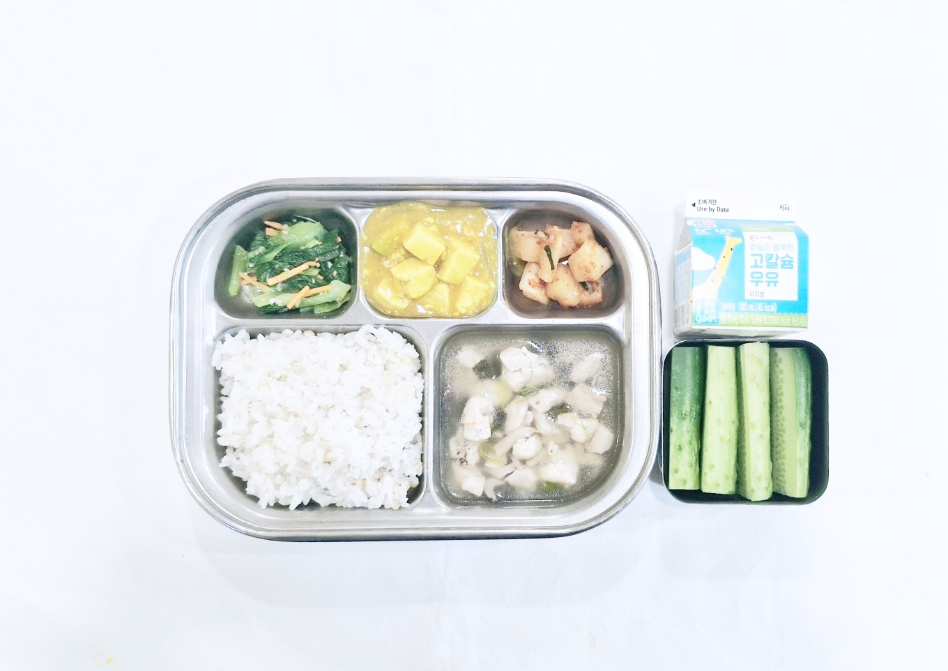 2024.12.11(수) 중식식단 - 보리밥, 닭살버섯국,두부카레조림,청경재나물,깍두기 (후)오이스틱, 우유