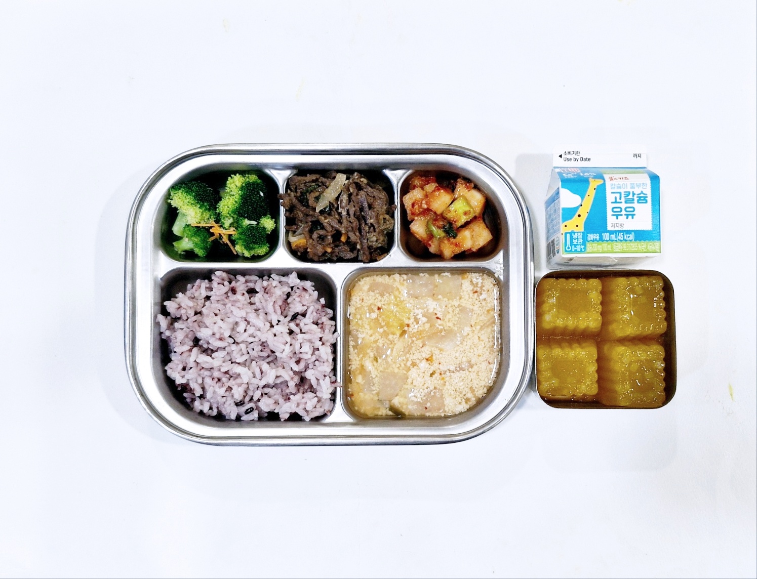 2024.12.12(목) 중식식단 - 흑미밥,콩비지찌개,쇠고기고사리볶음,브로콜리무침,깍두기 (후)망고푸딩, 우유