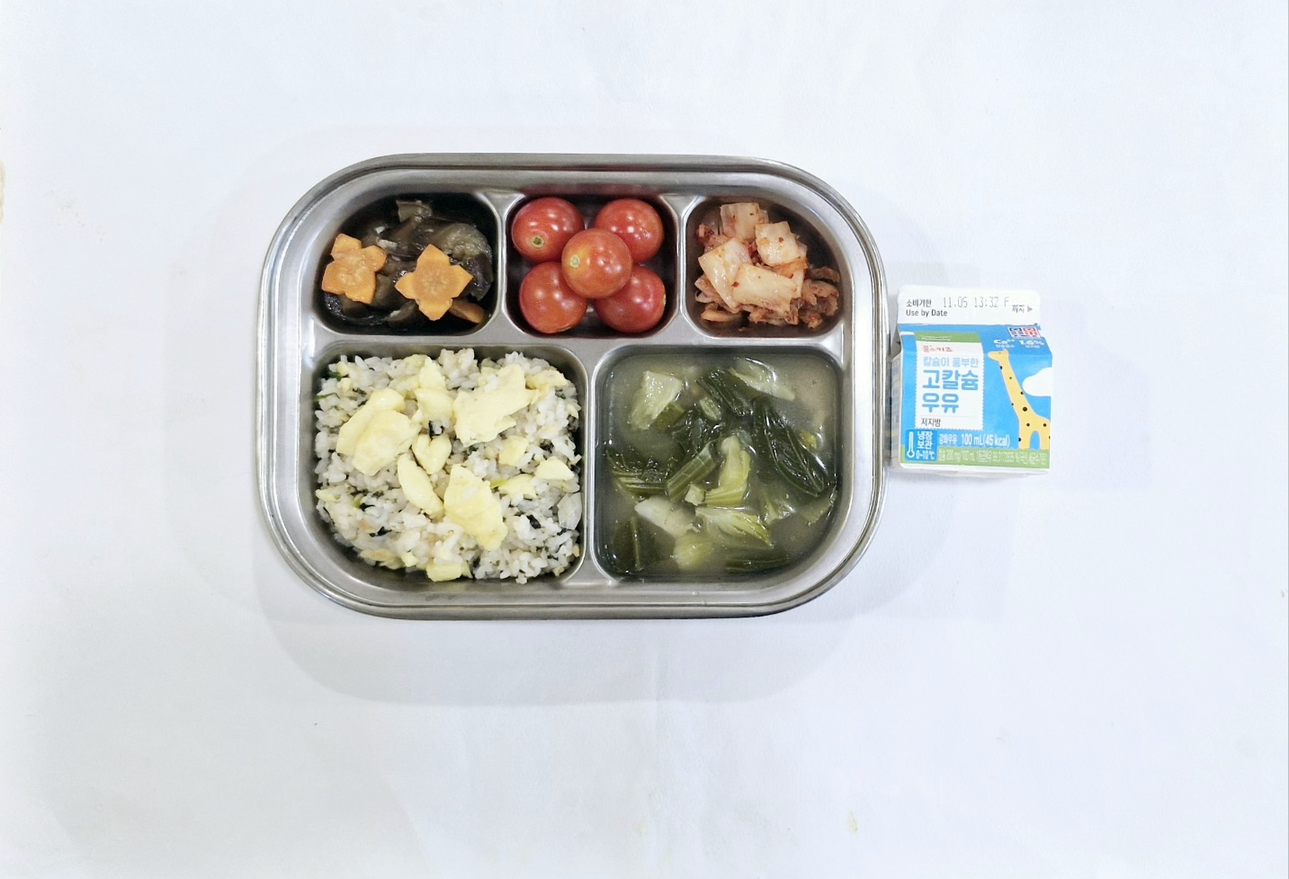 2024.10.31(목 ) 중식식단 - 달걀대파볶음밥, 청경채된장국,가지나물, 배추김치 (후)방울토마토, 우유