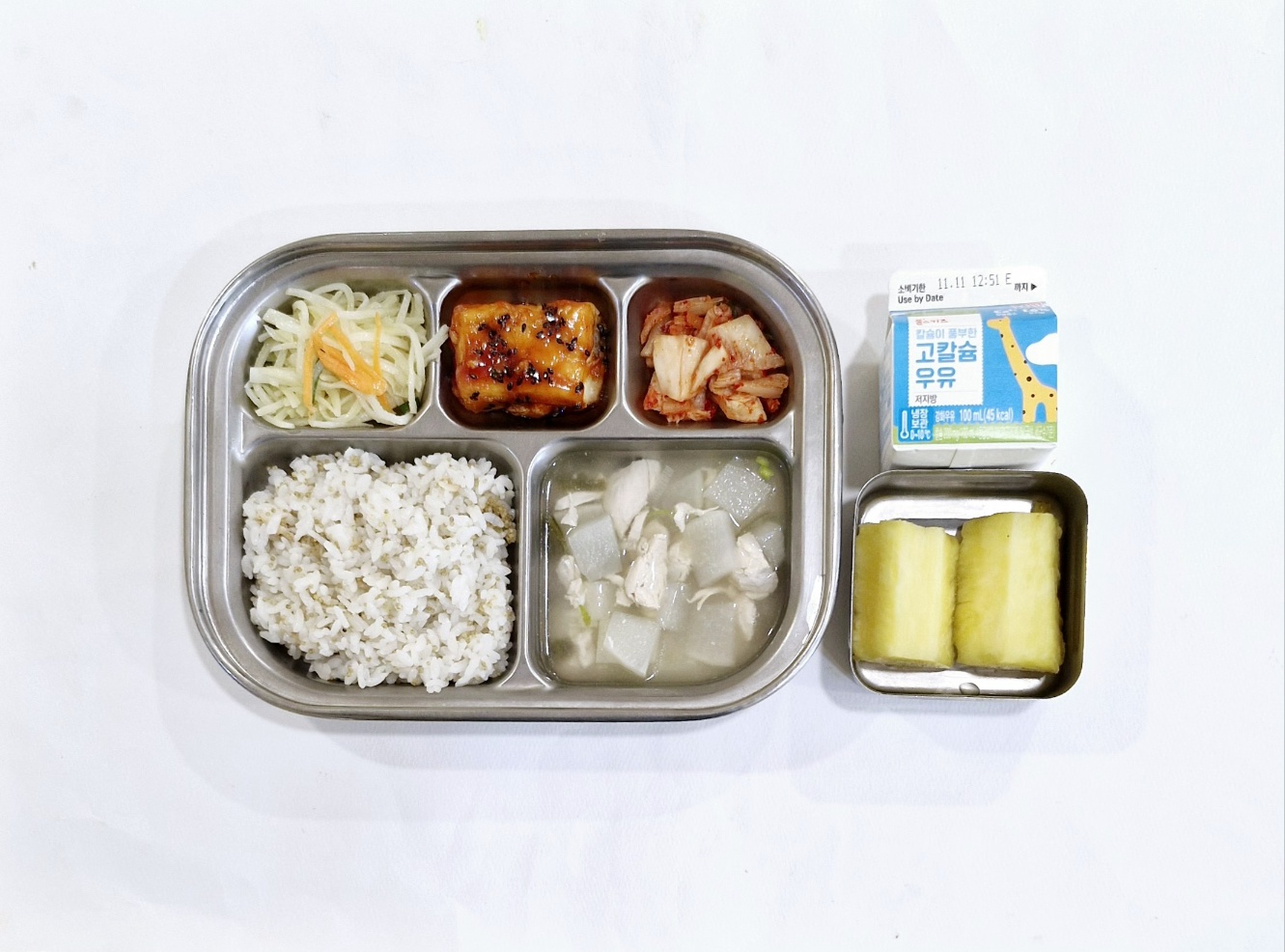2024.11.4(월 ) 중식식단 - 차조밥,닭살뭇국,두부조림,감자채볶음,배추김치 (후)파인애플, 우유
