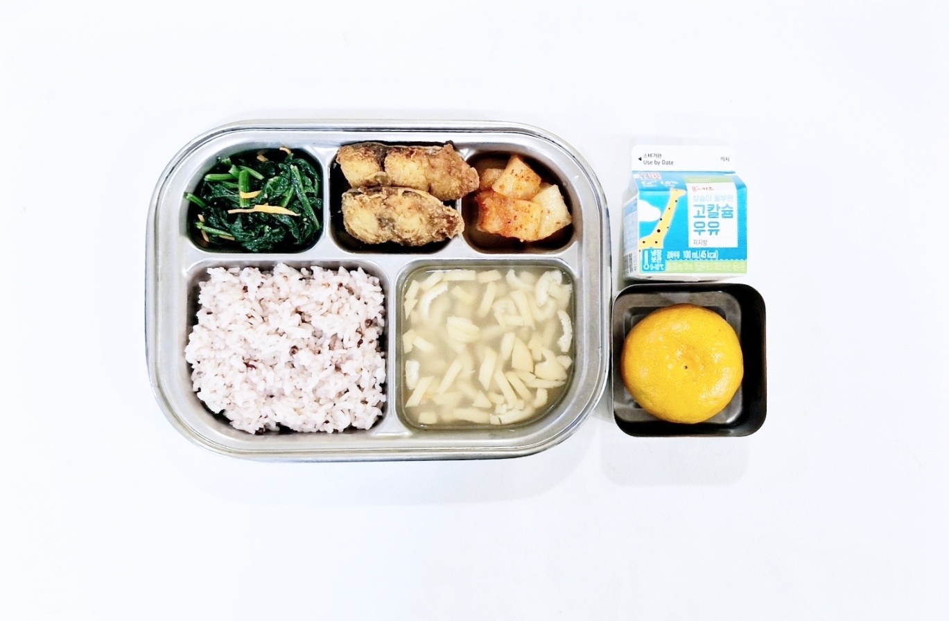 2024.11.7(목) 중식식단 - 수수밥,유부팟국,고등어구이,시금치나물,깍두기 (후)귤, 우유