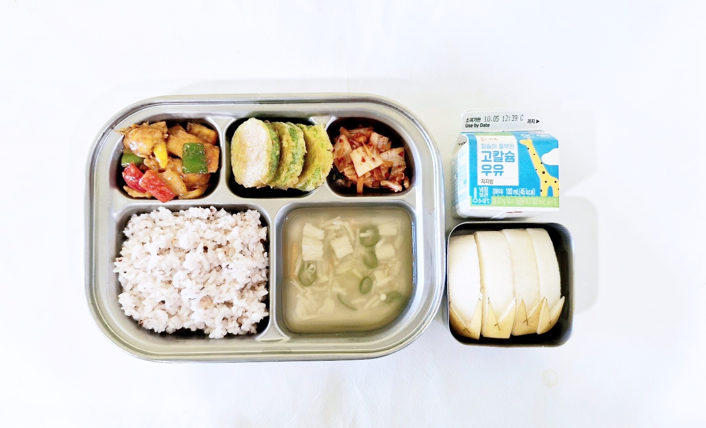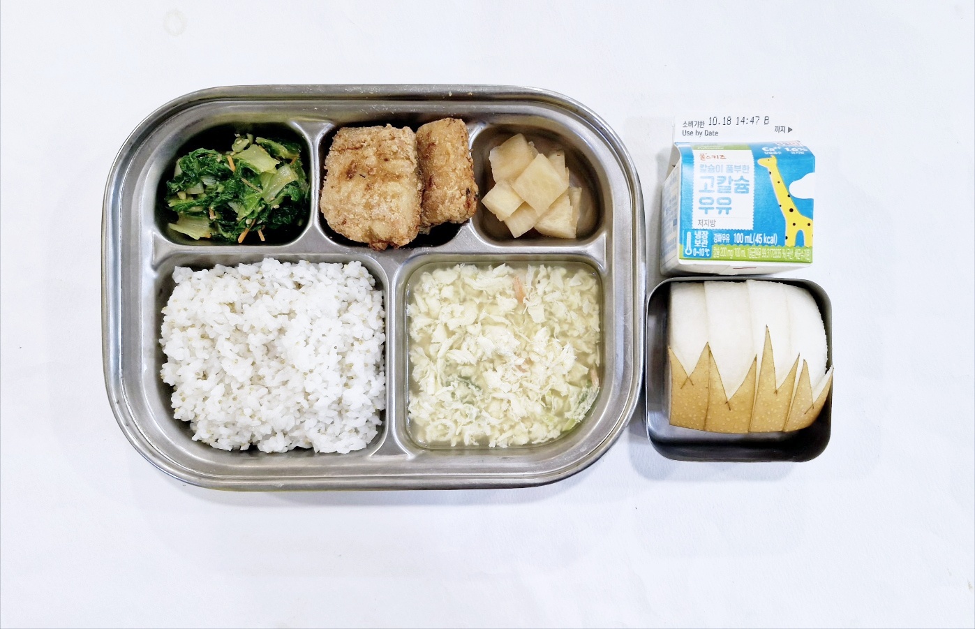 2024.10.10(목) 중식식단 - 차조밥,달걀팟국,삼치찹쌀부침,얼갈이나물,깍두기(후) 배,우유