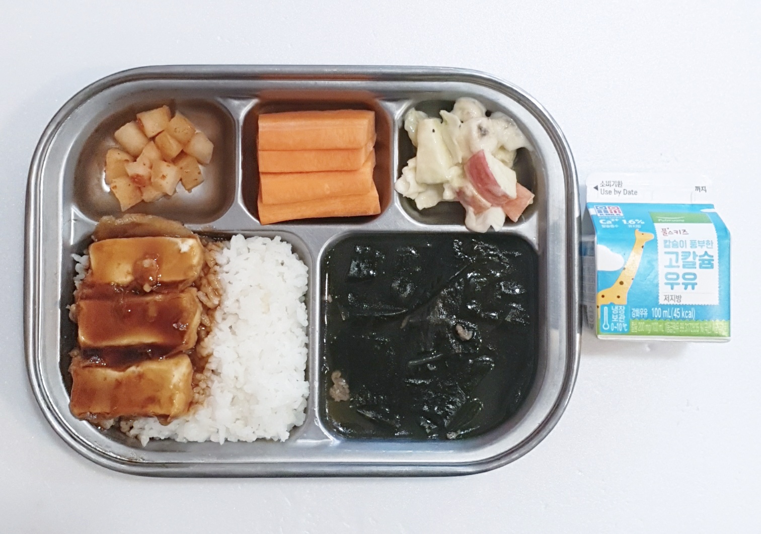 2024.10.2(수) 중식식단 - 두부데리야끼덮밥,쇠고기미역국,과일샐러드,깍두기(후)당근스틱,우유