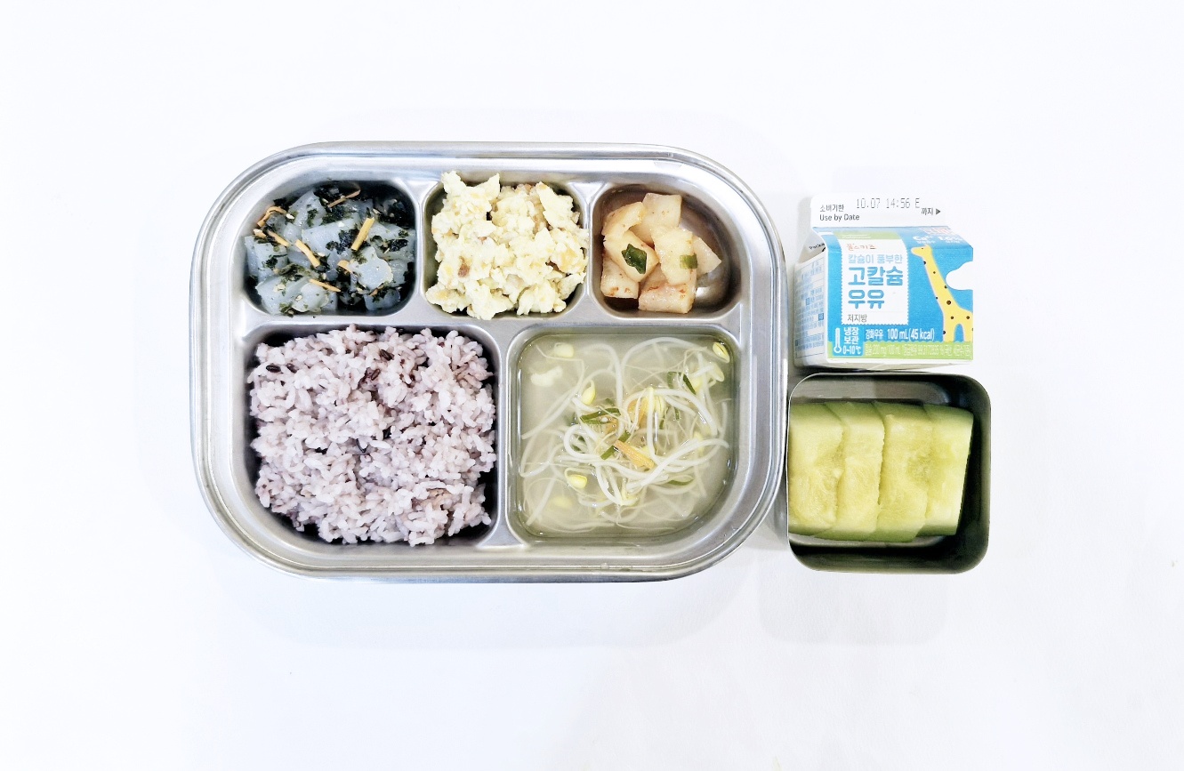 2024.10.7(월) 중식식단 - 흑미밥, 콩나물국,당근스크램블에그, 청포묵김무침, 깍두기(후)멜론,우유
