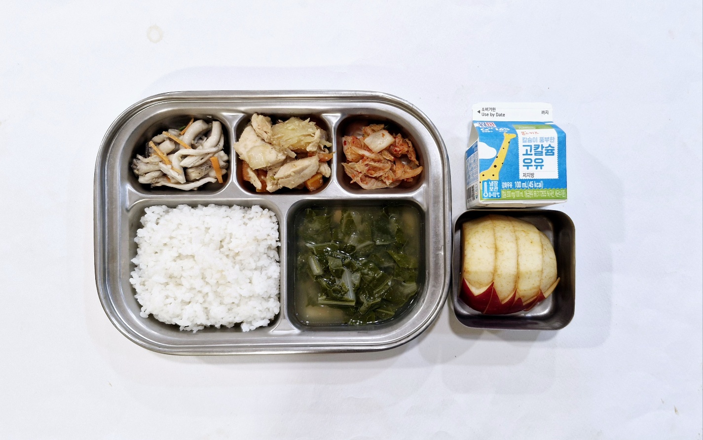 2024.10.11(금) 중식식단 - 백미밥,콩가루시금치국,닭살고구마조림, 느타리버섯나물, 배추김치(후) 사과, 우유