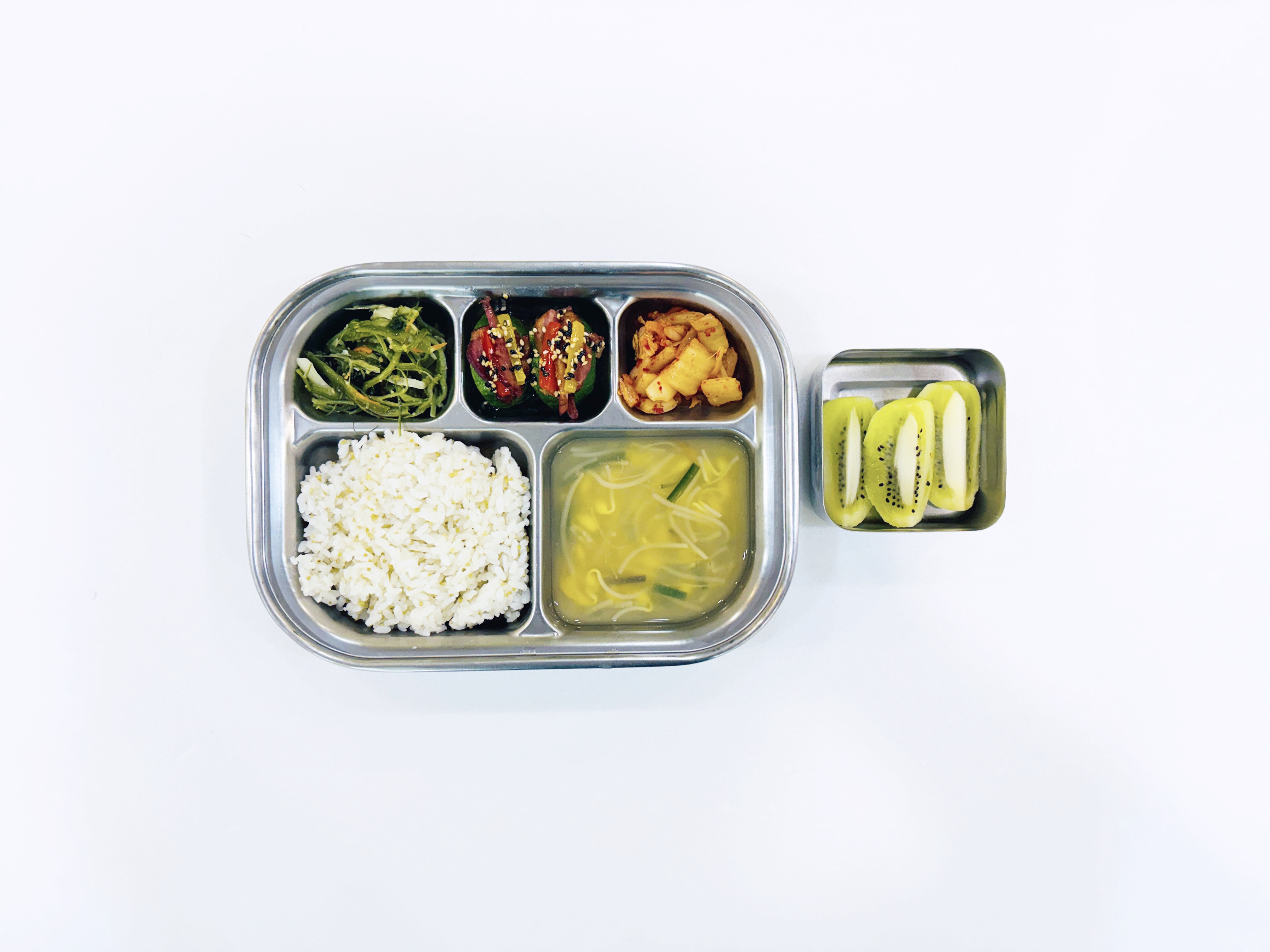 2026.2.24 (화) 중식식단 - 차조밥,콩나물된장국,훈제오리애호박찜,미역줄기볶음, 배추김치 (후)키위