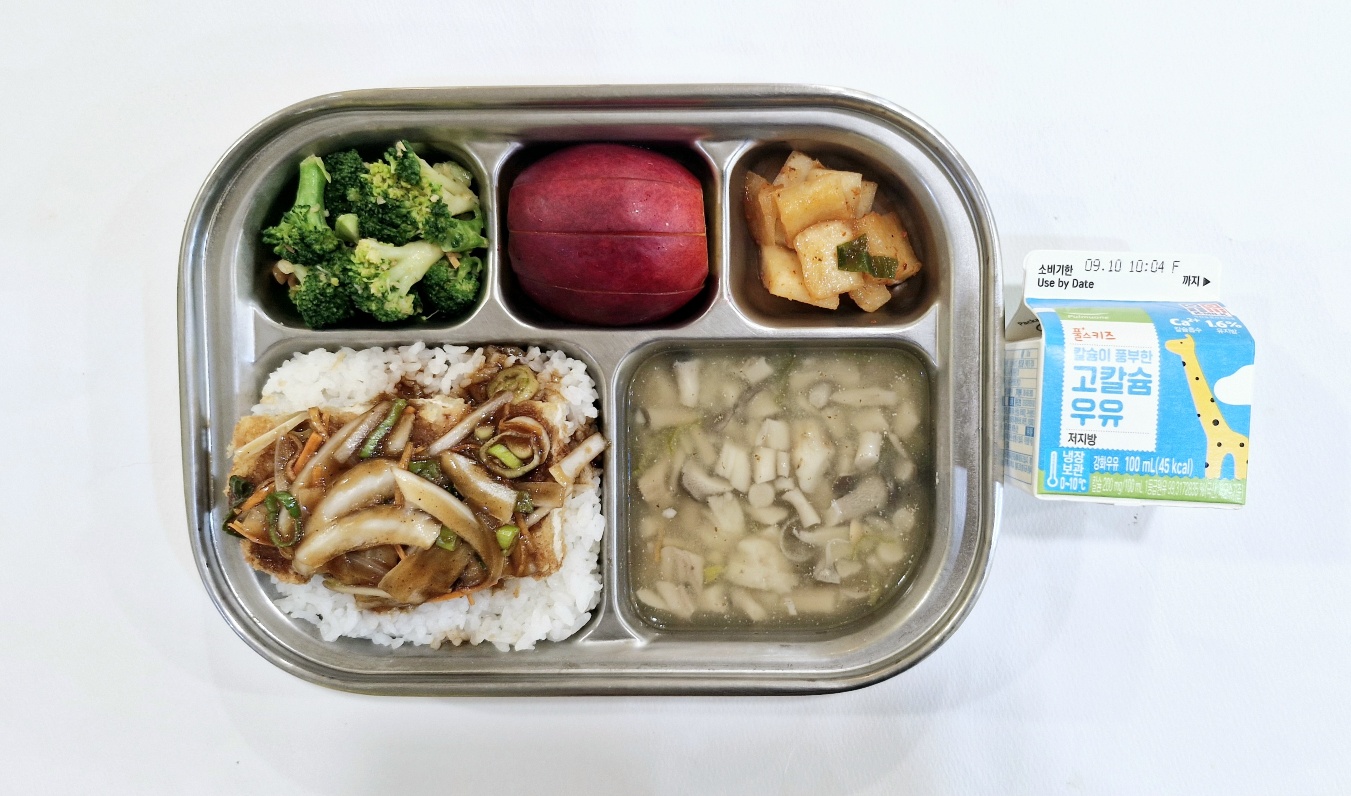 2024.9.4(수) 중식식단 - 치킨까스덮밥,느타리버섯국,브로콜리된장무침,깍두기 (후)천도복숭아,우유)