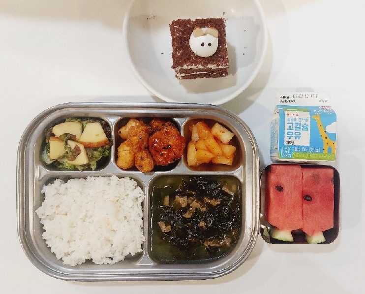 2024.6.25 (화) 중식식단 (백미밥,쇠고기미역국, 닭강정, 상추사과무침,깍두기 (후)케이크,수박, 우유)