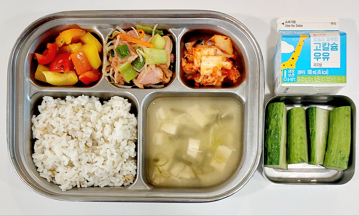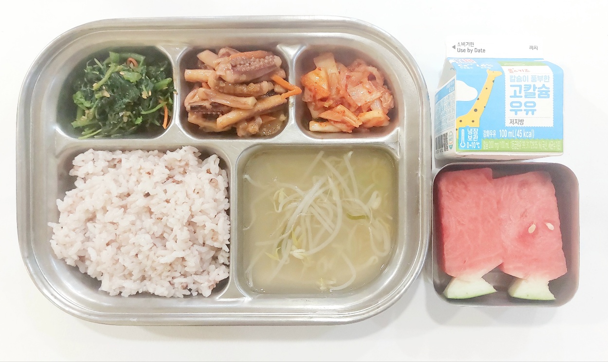 2024.7.2 (화) 중식식단 (수수밥,숙주된장국,오징어갈릭볶음,비름나물,배추김치 (후)수박, 우유)