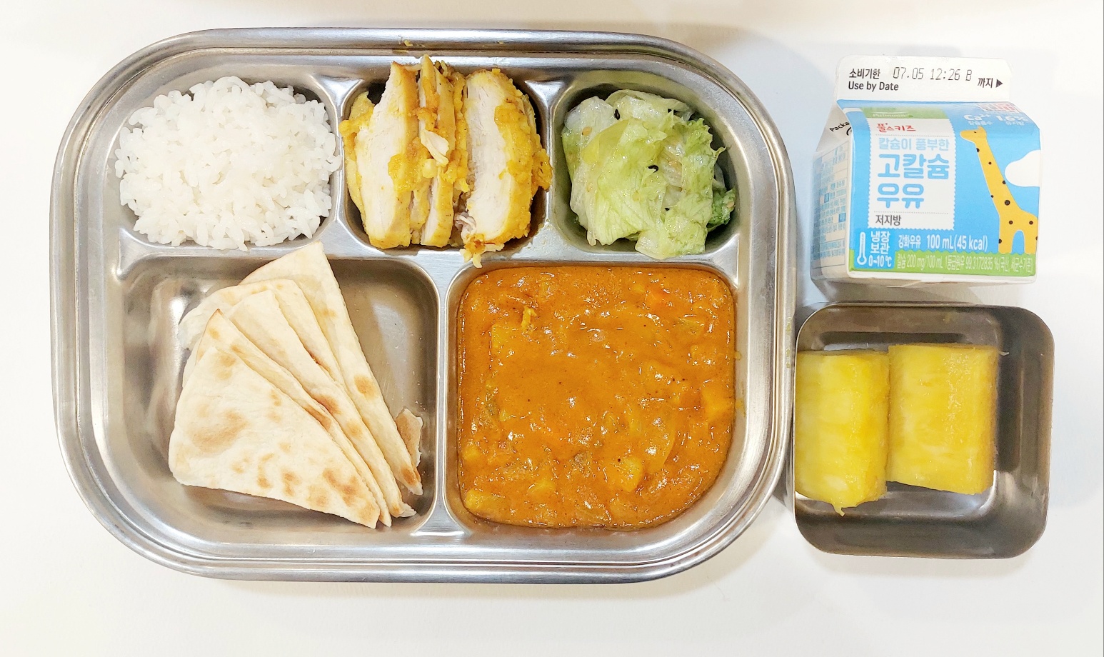 2024.6.27 (목) 중식식단 -글로벌 급식 (백미밥, 커리, 커리난, 탄두리치킨, 양상추샐러드 (후)파인애플, 우유)