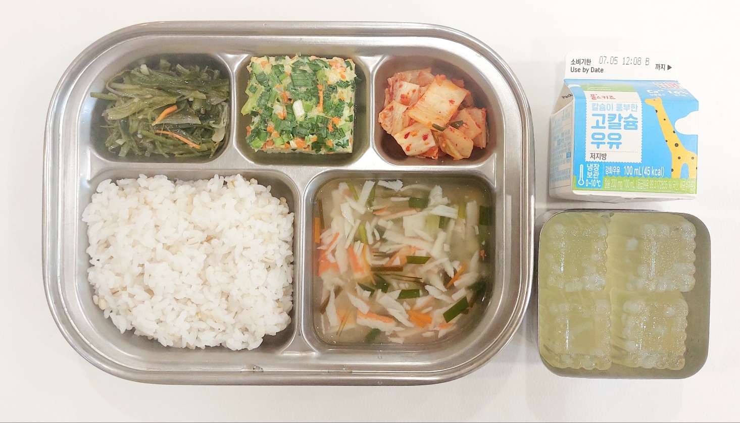 2024.6.28 (금) 중식식단 (보리밥,게살탕국,삼색달걀찜,미역줄기볶음,배추김치 (후)샤인머스캣푸딩, 우유)