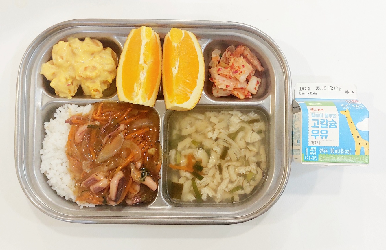 2024.6.5 (수) 중식식단 (오징어채소덮밥,유부팟국,단호박샐러드,배추김치(후)오렌지, 우유)