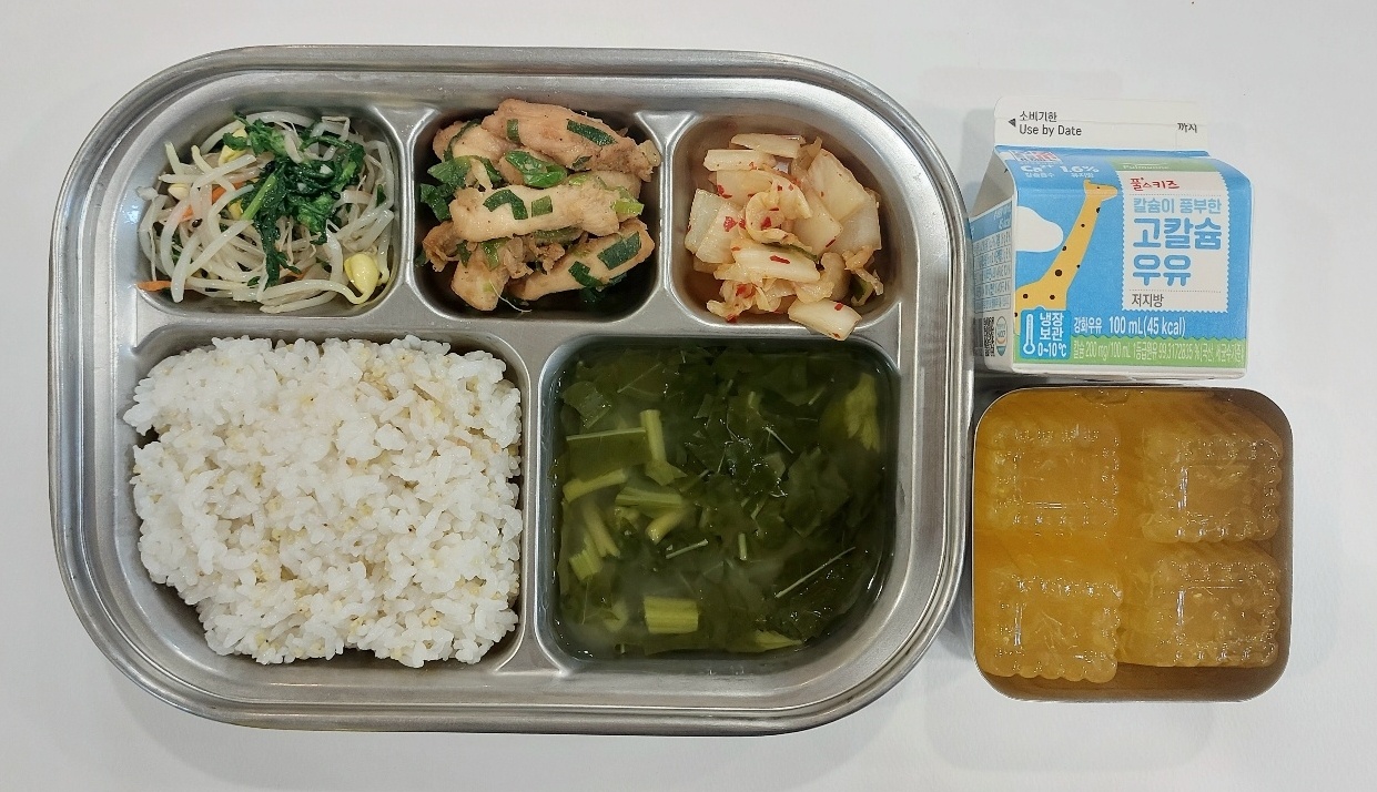 2024.6.13 (목) 중식식단 (기장밥,아욱맑은국, 닭살부추볶음,콩나물쑥갓무침, 배추김치 (후)밀감푸딩, 우유)