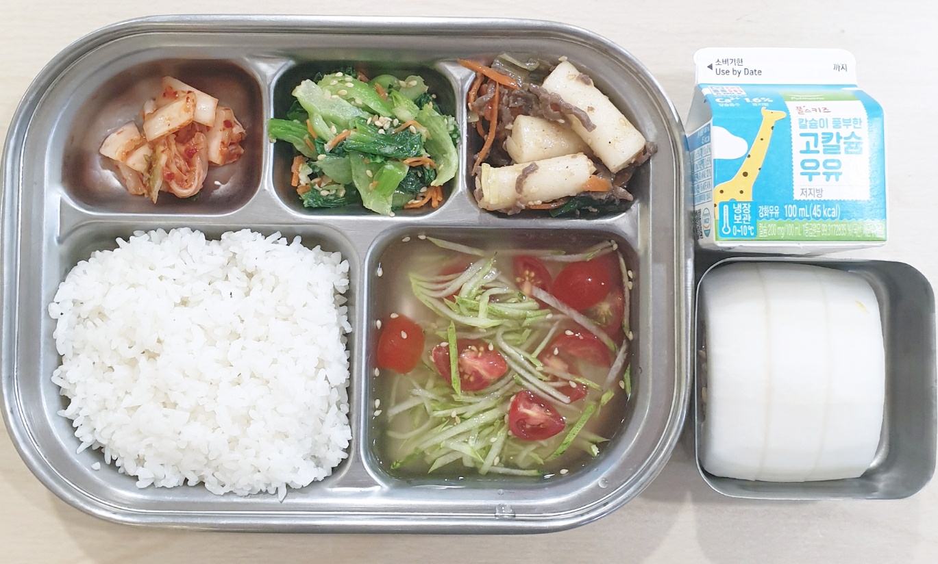 2024.6.14 (금) 중식식단 (백미밥,방울토마토오이냉국,쇠고기떡찜,청경채나물, 배추김치 (후)참외, 우유)