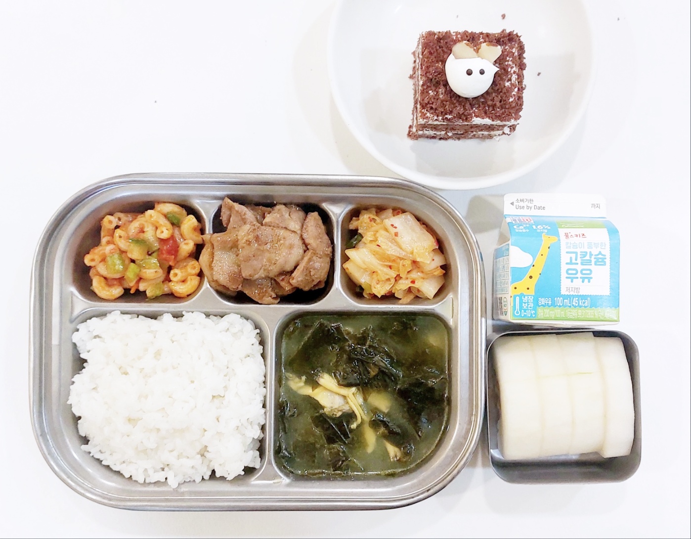 2024.5.28 (화) 중식식단 - 생일식단 (백미밥,바지락살미역국,돼지고기데리야끼구이,마카로니샐러드,배추김치 (후)케이크,참외,우유)