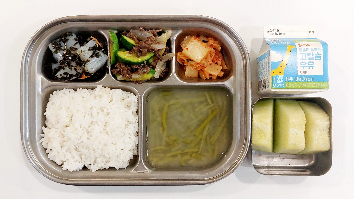 2024.6.3 (월) 중식식단 (백미밥,고구마순된장국,쇠고기애호박볶음,청포묵무침,배추김치(후)멜론, 우유)