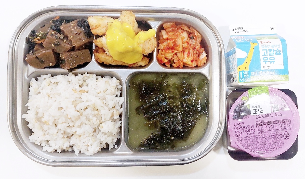 2024.5.9(목) 중식식단 -보리밥,미역국, 닭살버터구이, 도토리묵&양념장, 배추김치(후)포도푸딩,우유)