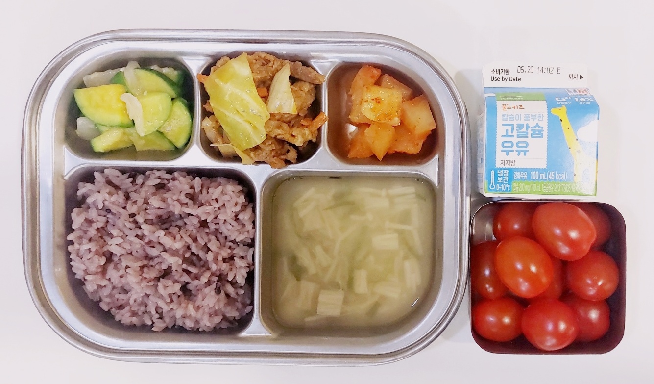 2024.5.14(화) 중식식단 - 흑미밥,팽이버섯맑은국,제육볶음,애호박나물, 깍두기 ((후)방울토마토,우유)