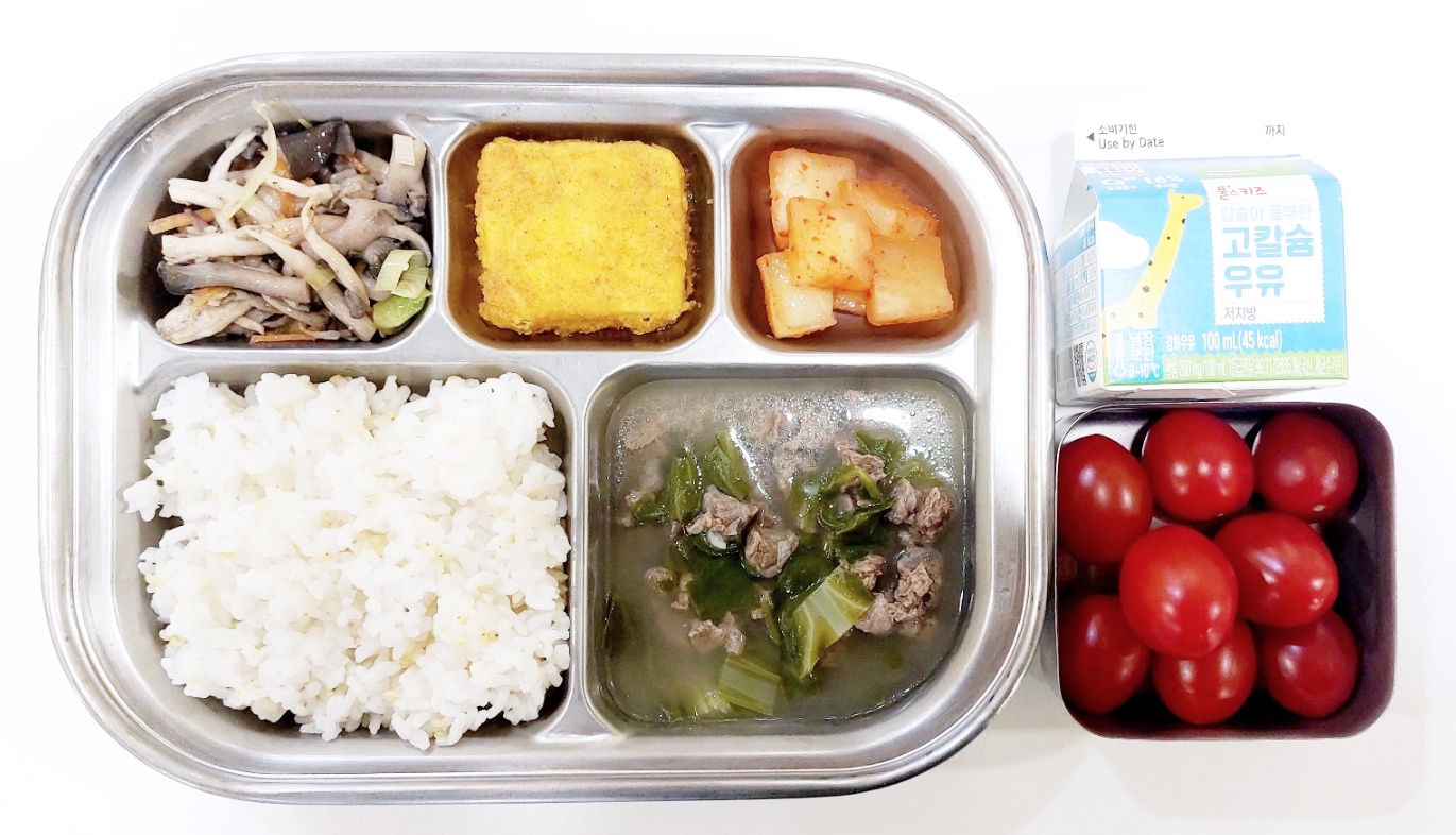 2024.4.2(화) 중식식단 (기장밥,쇠고기근대국,두부카레부침,느타리버섯볶음,깍두기 (후)방울토마토, 우유)