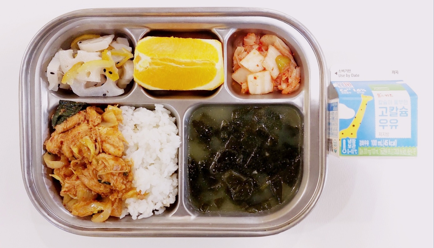 2024.4.3(수) 중식식단 (닭갈비덮밥,미역국,연근유자청무침,배추김치 (후)오렌지, 우유)