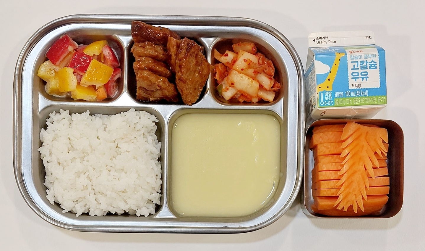 2024.4.4(목) 중식식단 (백미밥,크림스프, 함박스테이크, 파프리카샐러드, 배추김치 (후)당근스틱, 우유)
