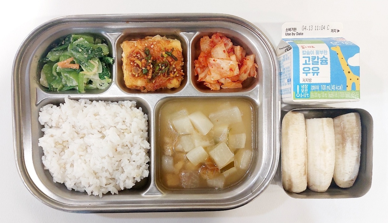 2024.4.8(월) 중식식단 (보리밥,북엇국,두부조림.청경채나물,배추김치 (후)바나나, 우유)