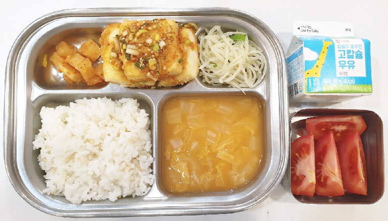 2024.3.14(목) 중식식단 (현미밥,김칫국,두부구이&양념장,감자채볶음,깍두기 (후)토마토, 우유)