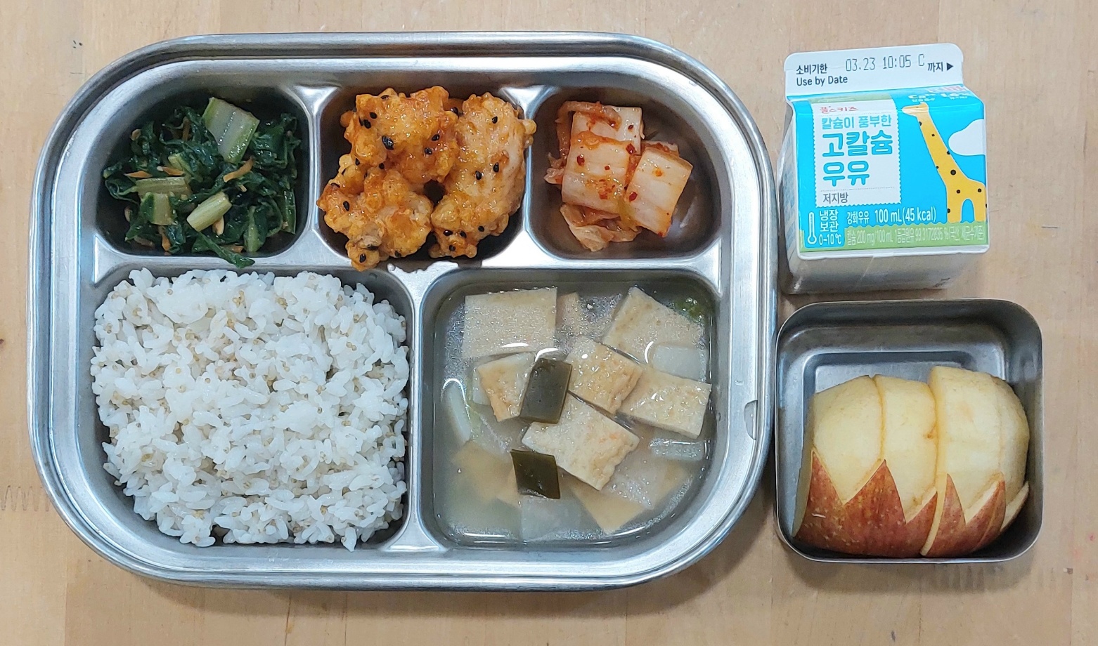2024.3.15(금) 중식식단 (차조밥,어묵국,닭살케찹조림,근대나물,배추김치 (후)사과, 우유)