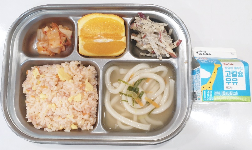 2024.3.20(수) 중식식단 (오므라이스, 미니우동, 우엉사과샐러드, 배추김치 (후)오렌지, 우유)