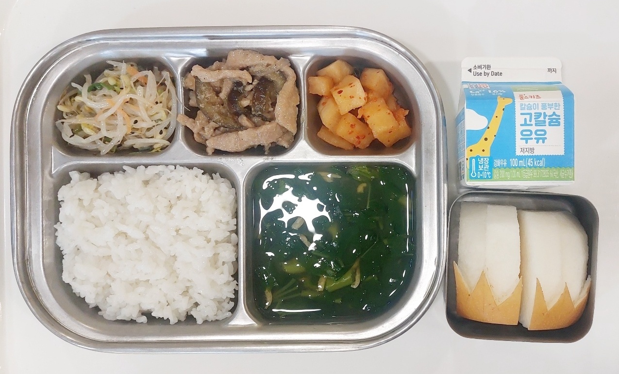 2024.3.8(금) 중식식단 (백미밥, 건새우마욱국,돼지고기가지볶음,숙주무침, 깍두기 (후)배, 우유)