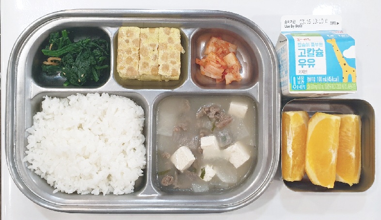2024.3.11(월) 중식식단 (백미밥, 쇠고기탕국,콘달걀찜,시금치나물,배추김치 (후)오렌지, 우유)