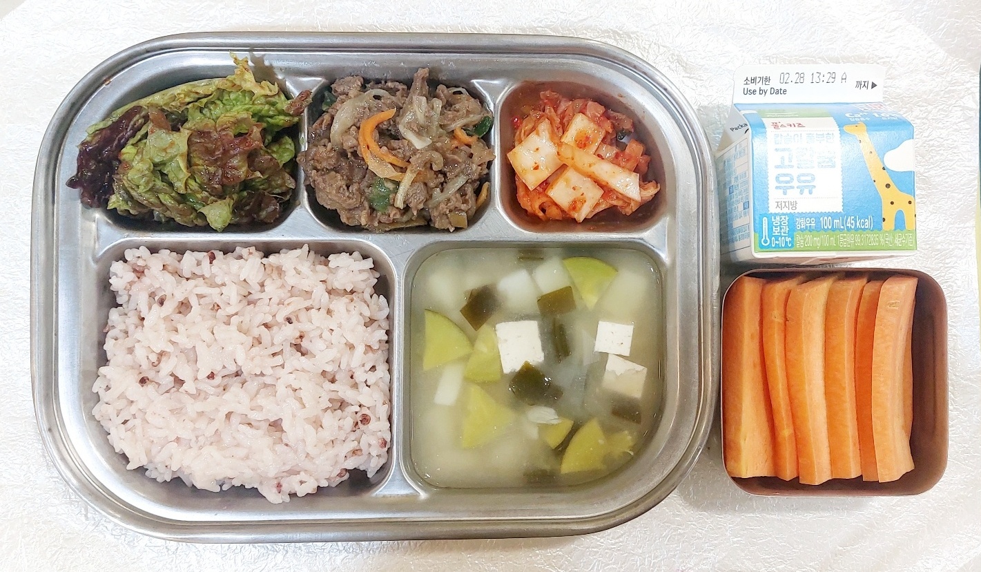 2024.2.21(수) 중식식단 (수수밥,된장찌개,쇠고기불고기,상추겉절이,배추김치 (후)당근스틱, 우유)