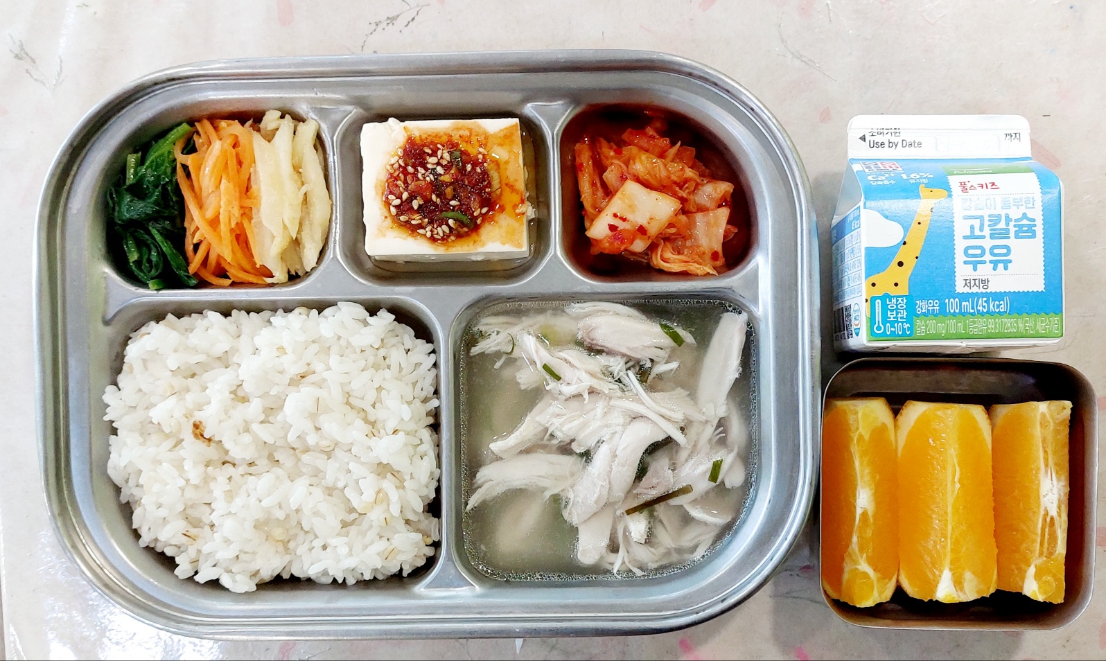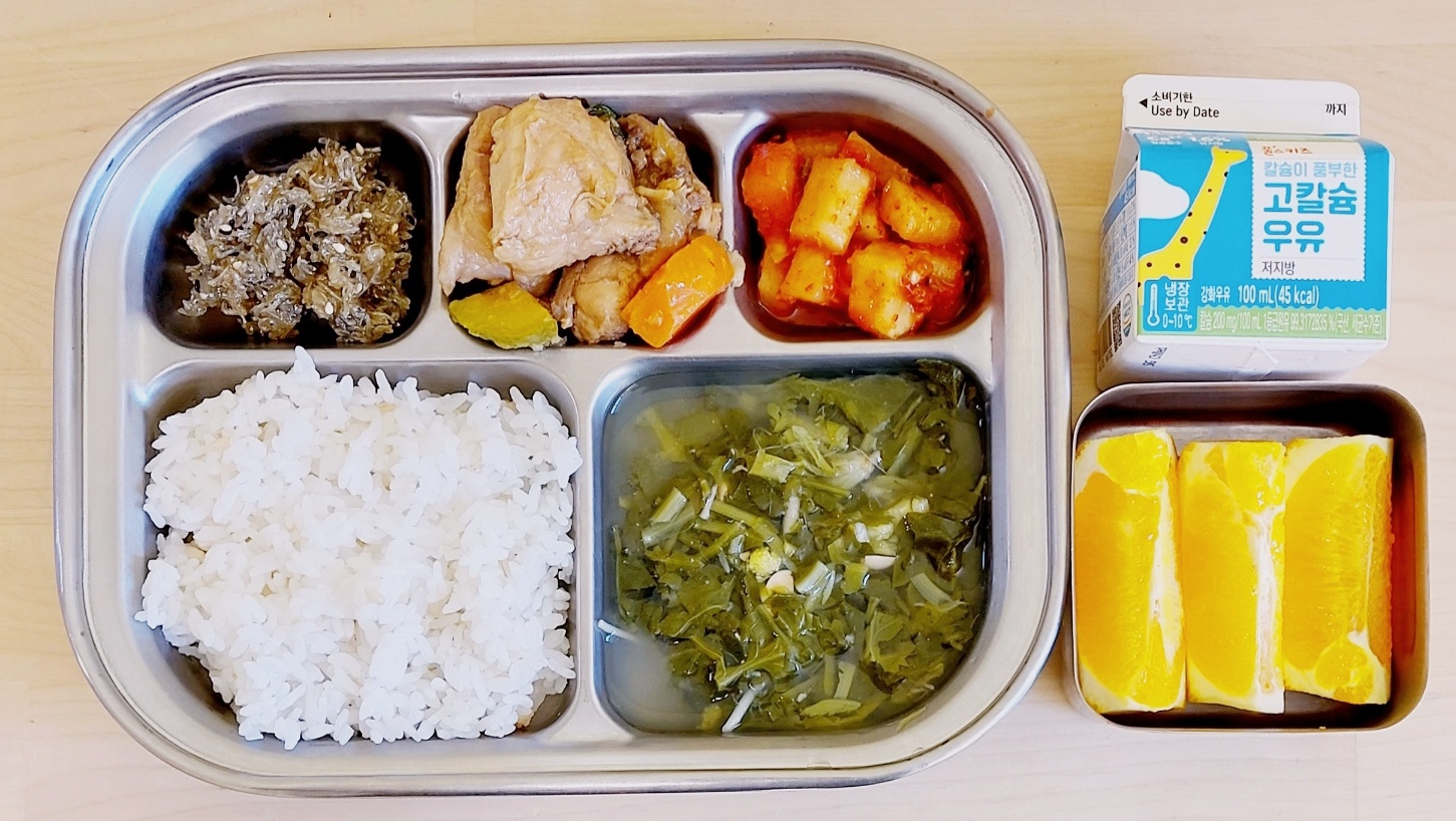 2024.2.23(금) 중식식단 (보리밥, 닭곰탕, 연두부&양념장, 삼색나물, 배추김치 (후)오렌지, 우유)