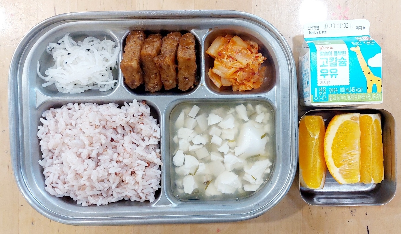 2024.3.4(월) 중식식단 (수수밥,버섯순두부찌개,쇠고기떡갈비,무생채, 배추김치 (후)오렌지, 우유)