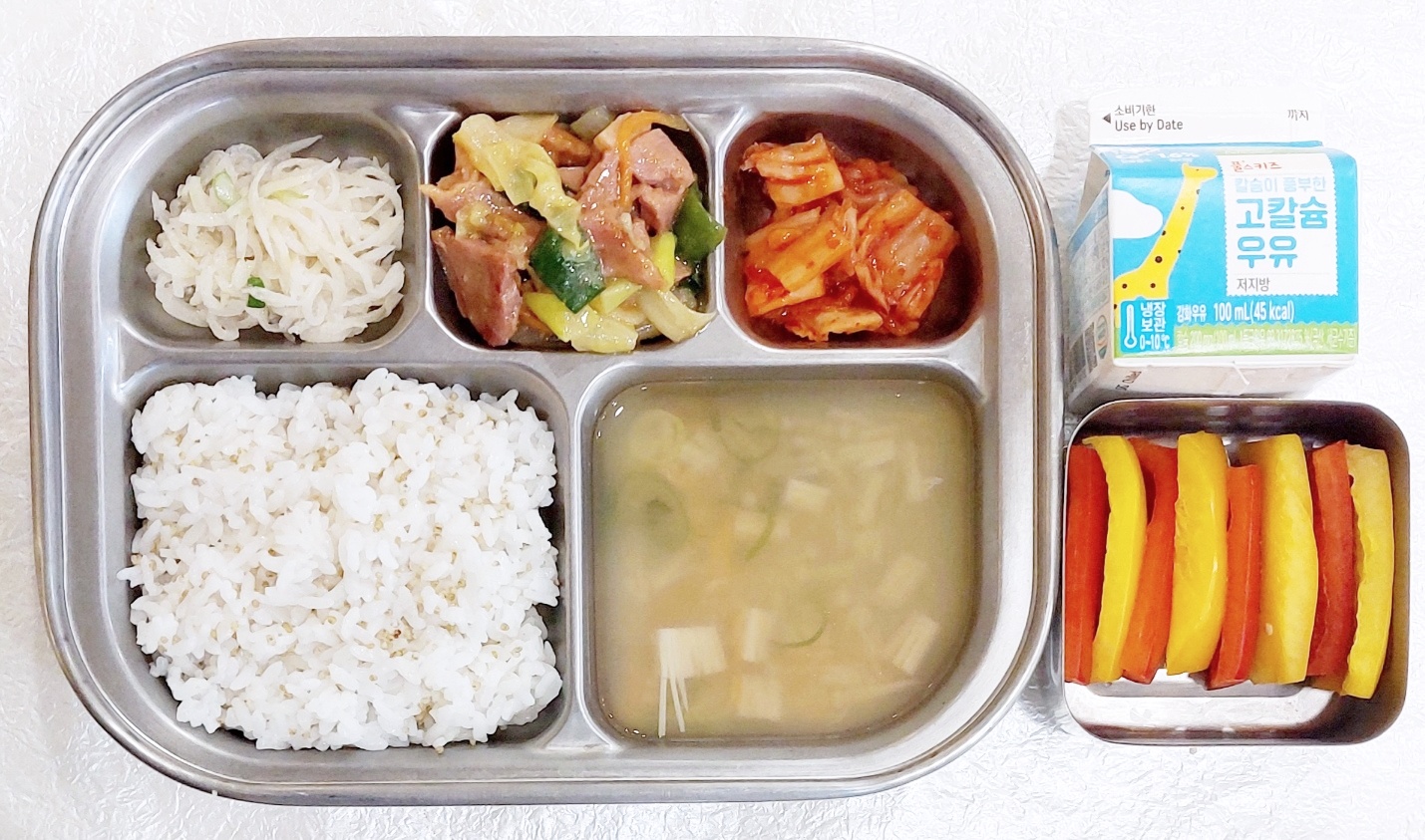 2024.2.13(화) 중식식단 (차조밥,팽이미소장국,훈제오리채소볶음,무나물,배추김치 (후)파프리카스틱, 우유)