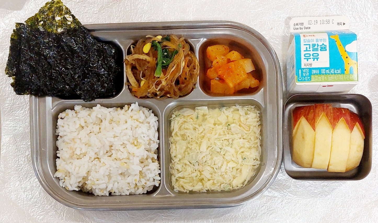 2024.2.14(수) 중식식단 (기장밥,달걀탕,콩나물어묵잡채,구이김,깍두기 (후)사과, 우유)