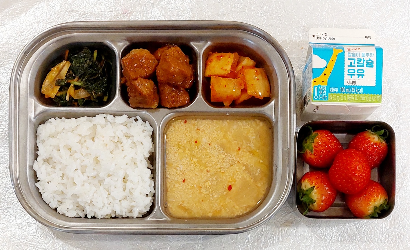 2024.2.16(금) 중식식단 (백미밥,콩비지찌개,돼지고기사태찜,깻잎나물,깍두기 (후)딸기, 우유)