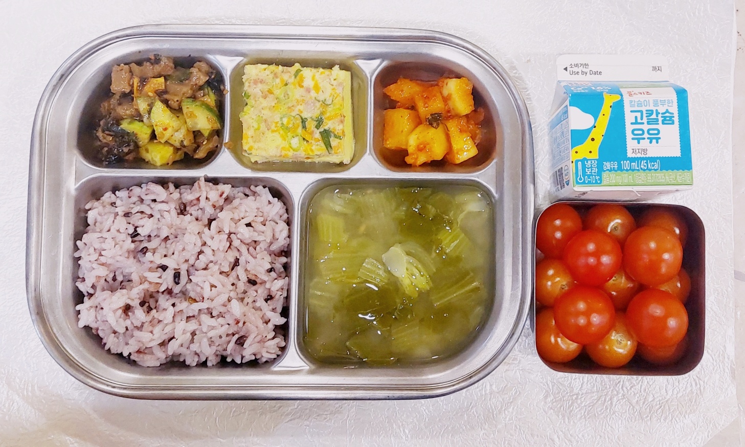 2024.2.19(월) 중식식단 (흑미밥, 청경채맑은국,베이컨달걀찜,도토리묵무침, 깍두기 (후)방울토마토, 우유)