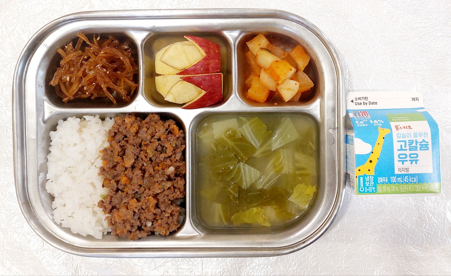 2024.1.31(수) 중식식단 ( 쇠고기채소덮밥, 봄동맑은국, 우엉조림, 깍두기 (후)사과, 우유)