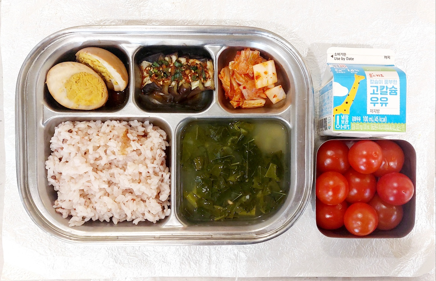 2024.2.1(목) 중식식단 (수수밥, 콩가루아욱국, 달걀장조림,구운가지무침, 배추김치 (후)방울토마토, 우유)
