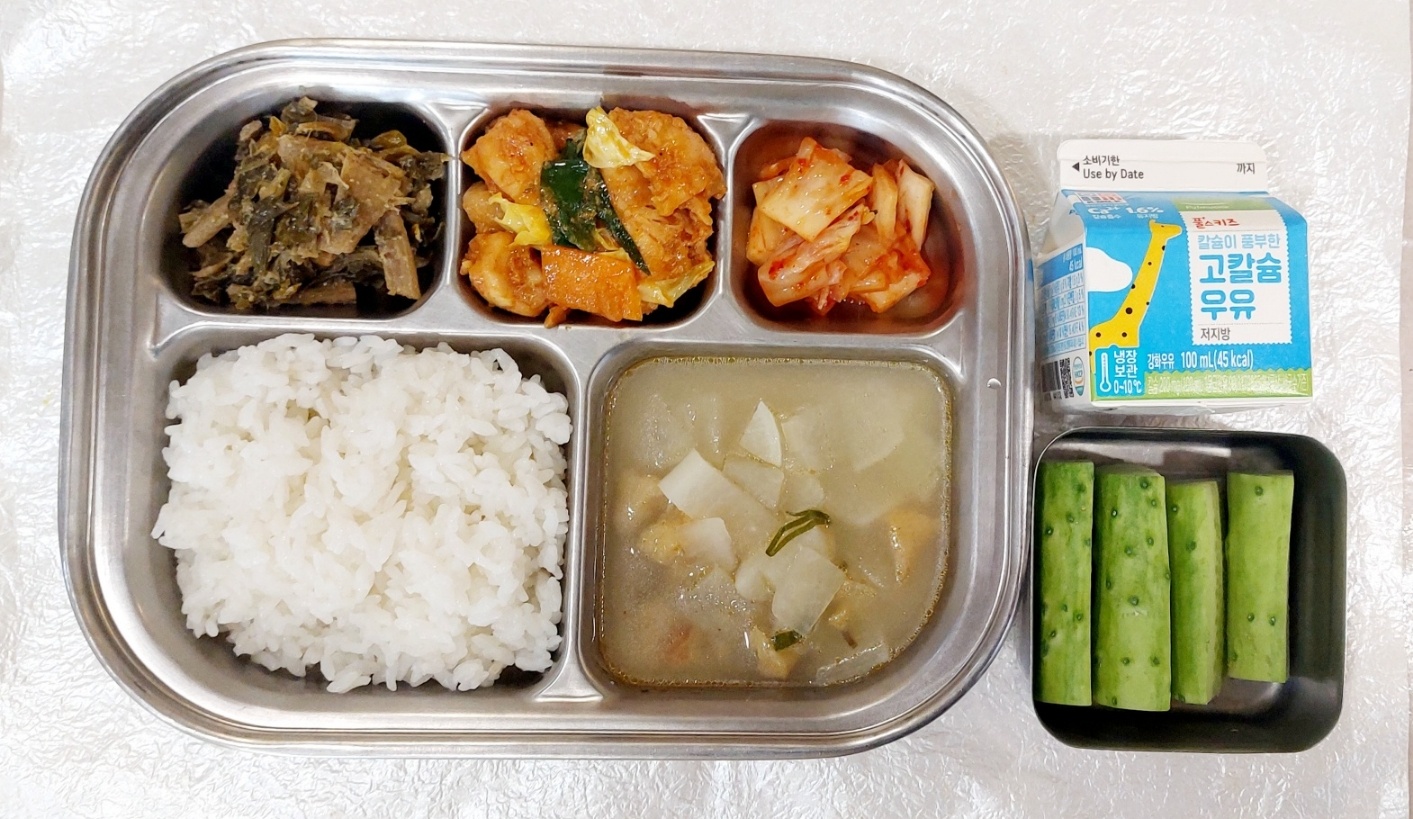 2024.2.2(금) 중식식단 (백미밥,북엇국, 닭갈비,시래기된장무침,배추김치 (후)오이스틱, 우유)